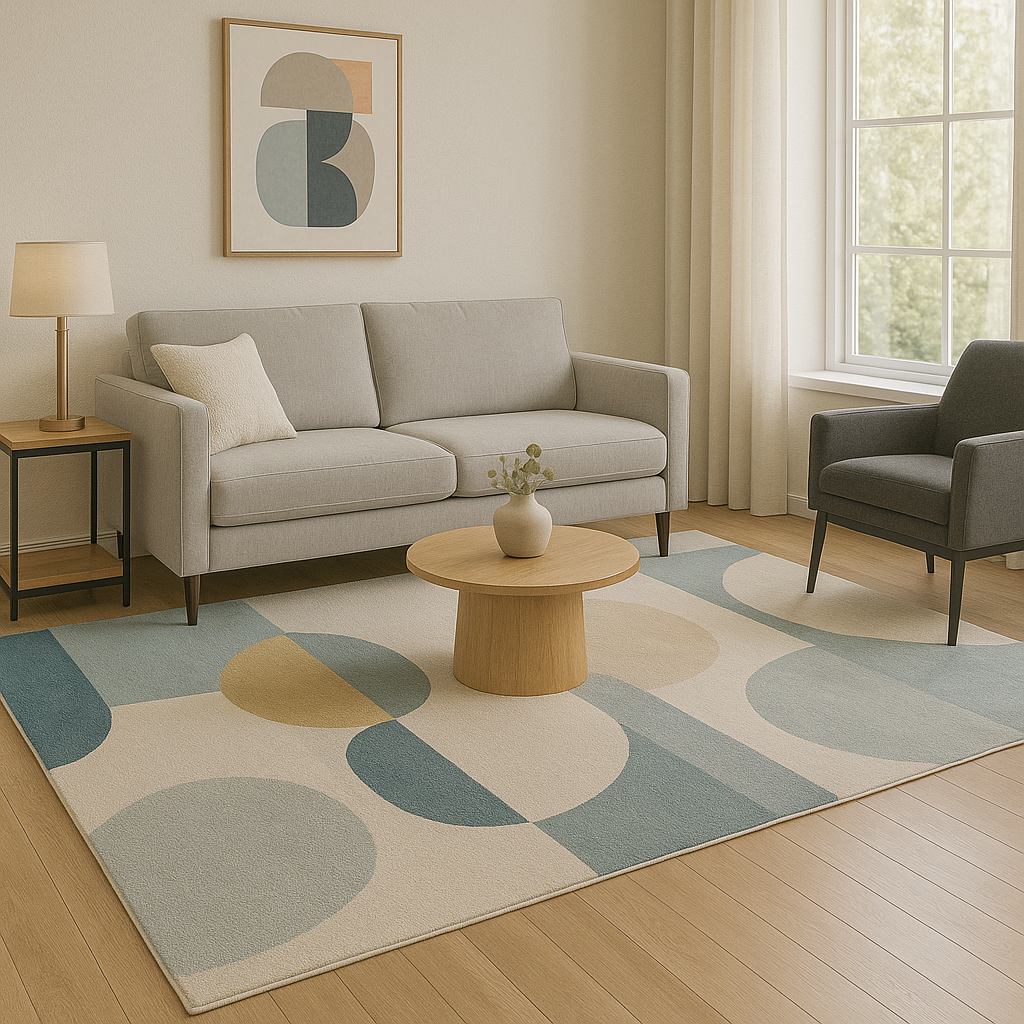 Premium polyester carpet with abstract geometric patterns in trendy pastel and blue-gray tones, with a modern artistic touch, creating a subtle highlight for the Scandinavian living room.