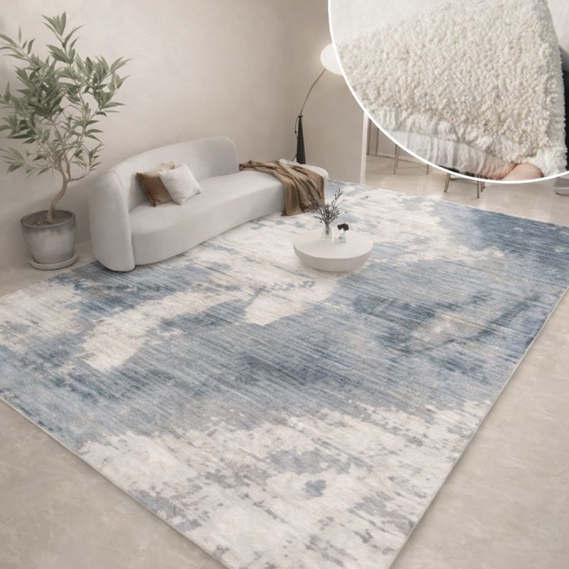 This abstract patterned rug in soothing blue and white tones creates a relaxing, modern, and luxurious feel, easily complementing light-colored sofas and minimalist living room spaces.