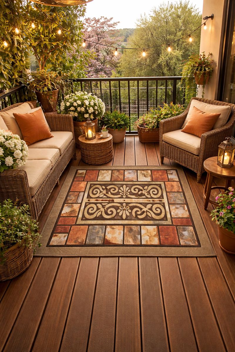 This rug features an antique brick pattern with a central swirling design and warm earthy tones, creating a rustic yet elegant feel. Suitable for balconies.