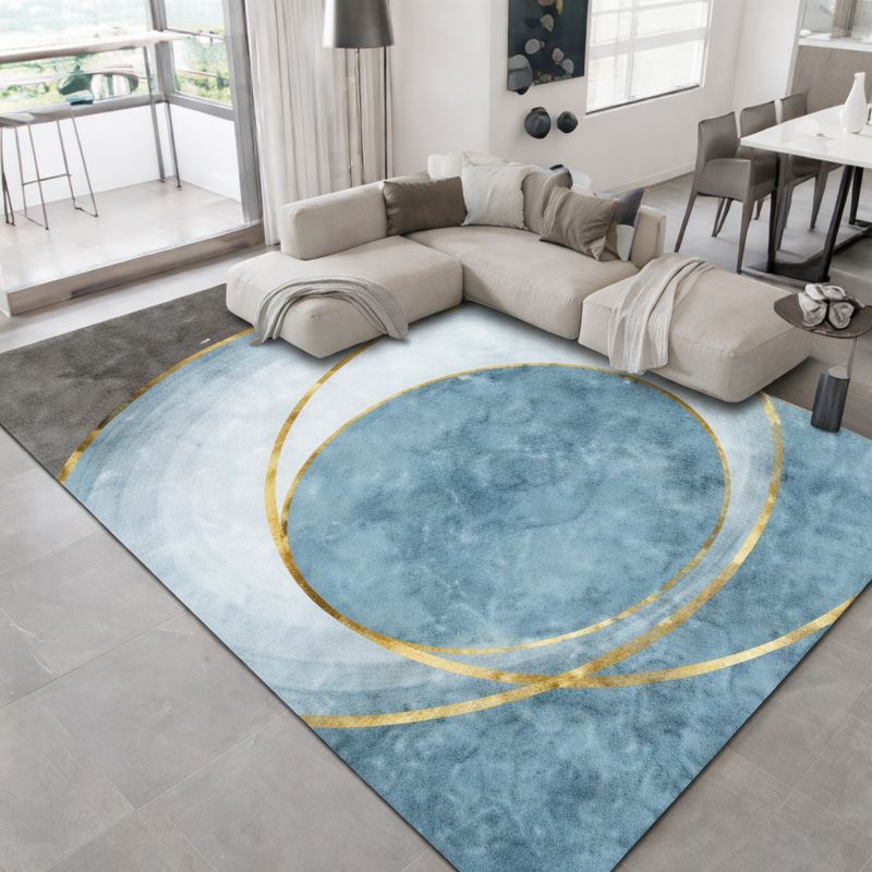 This living room rug features an abstract pattern with blue circles accented in gold, creating a modern and luxurious style.