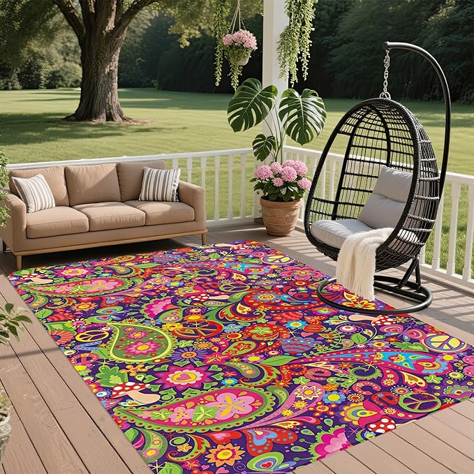 This vibrant boho-patterned rug features colorful, swirling designs that evoke a cheerful and carefree feeling. It’s perfect for balconies, gardens, or outdoor relaxation spaces.