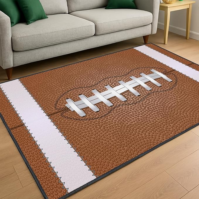 This rugby ball patterned rug in warm, deep brown tones features a simple yet stylish design; suitable for living rooms and bedrooms.