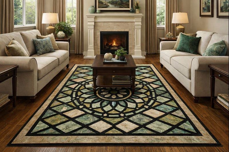 The rug stands out with its symmetrical central floral pattern combined with a geometric frame, and a harmonious color scheme of blue, beige, and black.