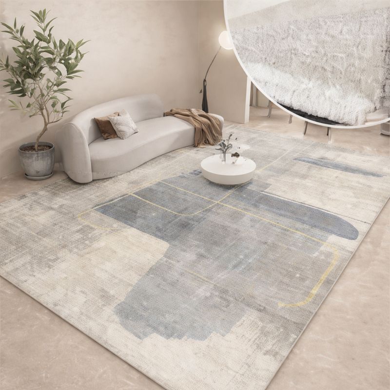 This abstract patterned rug in shades of gray, beige, and light blue, accented with subtle gold, has a modern style, creating a light, elegant feel and easily complementing various living room spaces.