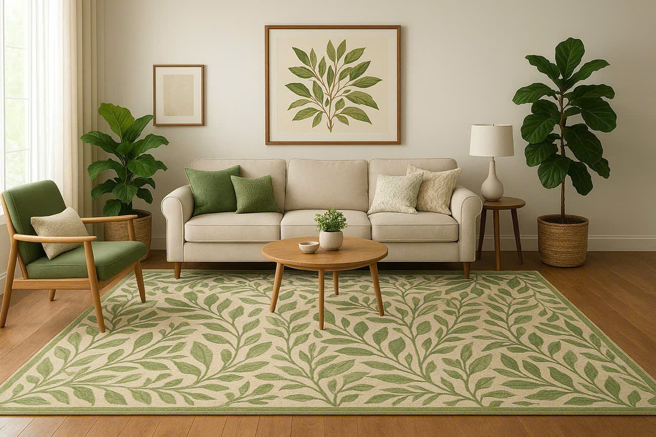 Soft Scandinavian green leaf carpet for a cool, soothing home
