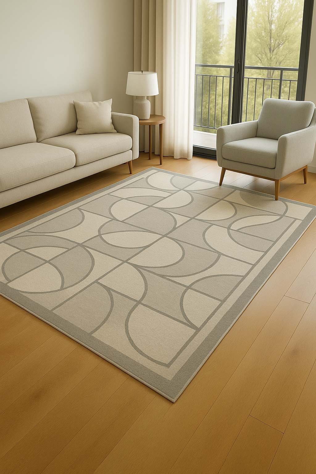 The carpet is mainly beige and light gray, very elegant and easy to match with the interior. The geometric pattern consists of interwoven curves and squares, creating a sense of balance and sophistication.