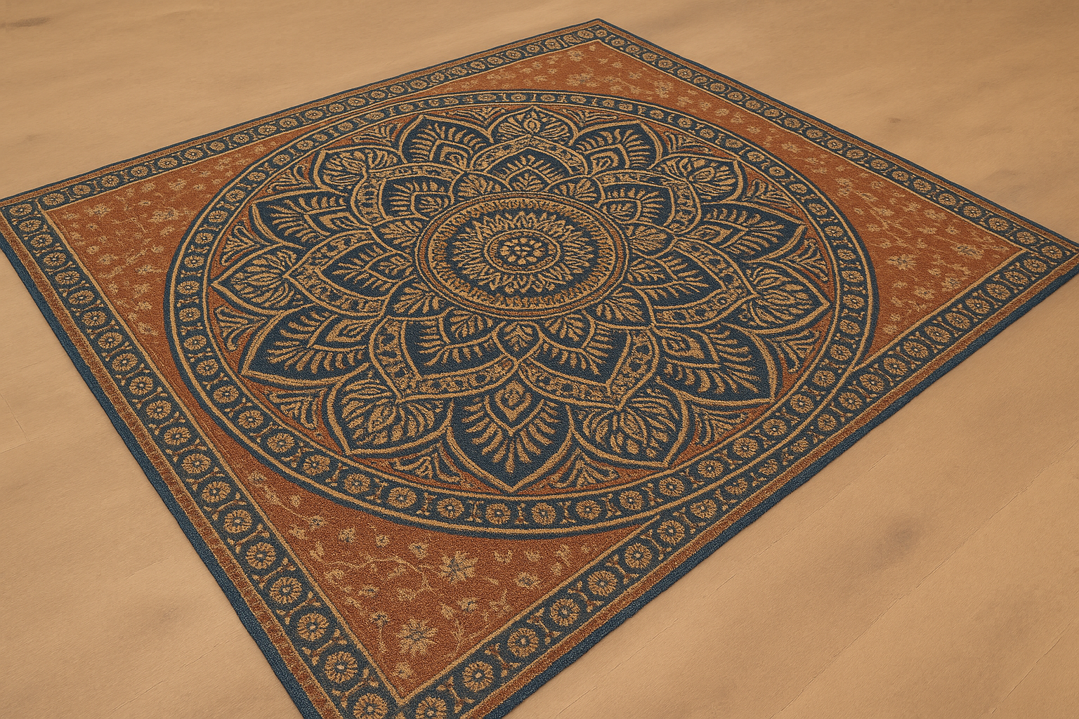 Heritage Mandala rug features a classic mandala pattern that symbolizes harmony and tranquility. The earthy brown and indigo tones create cultural depth, suitable for meditation spaces, living rooms or exhibition areas with the spirit of Asian art.