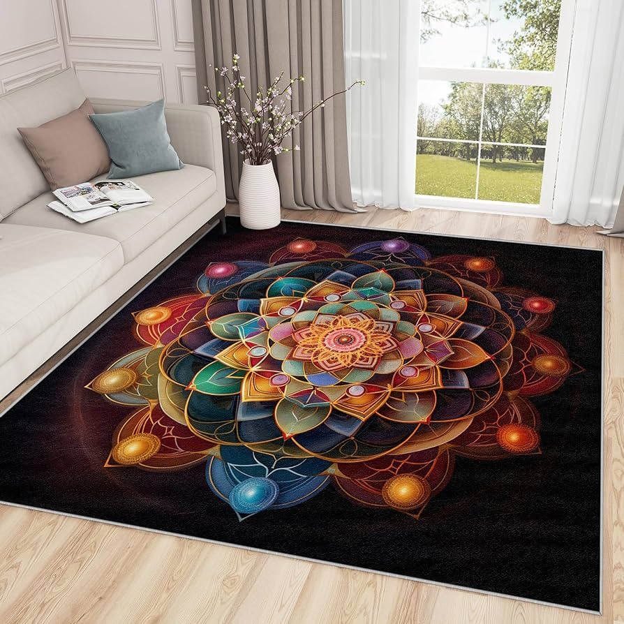 Multi-colored mandala rug on black background, brilliant rotating petal pattern, creating a mysterious – meditative – powerful energy effect for the space.