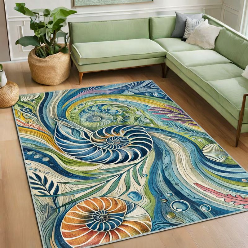 This rug features an artistic swirling nautilus shell pattern, inspired by the ocean with a color palette of blue, green, and turquoise combined with warm orange tones. The soft lines and subtle color transitions create a sense of movement.