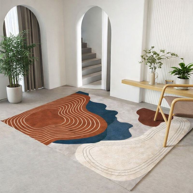 This modern abstract rug features a soft, flowing pattern and a harmonious blend of earthy brown, green, and cream colors, creating a subtle, warm, and luxurious focal point for the living room.