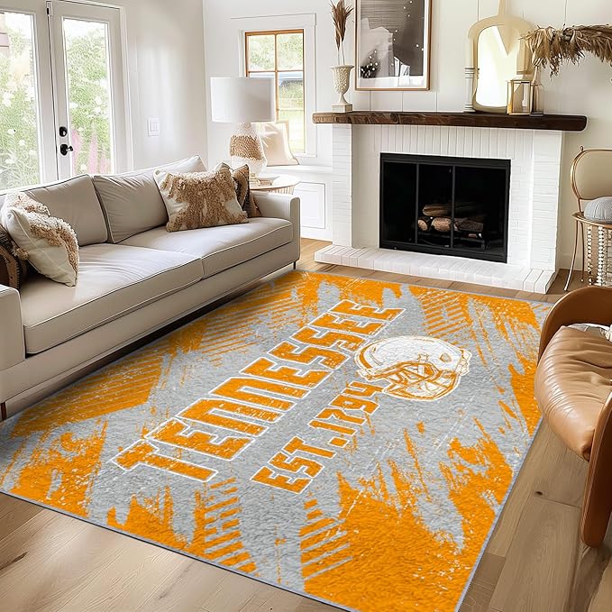 This rug stands out with its orange and gray tones and a sporty Tennessee print, bringing a dynamic and energetic feel to the room.