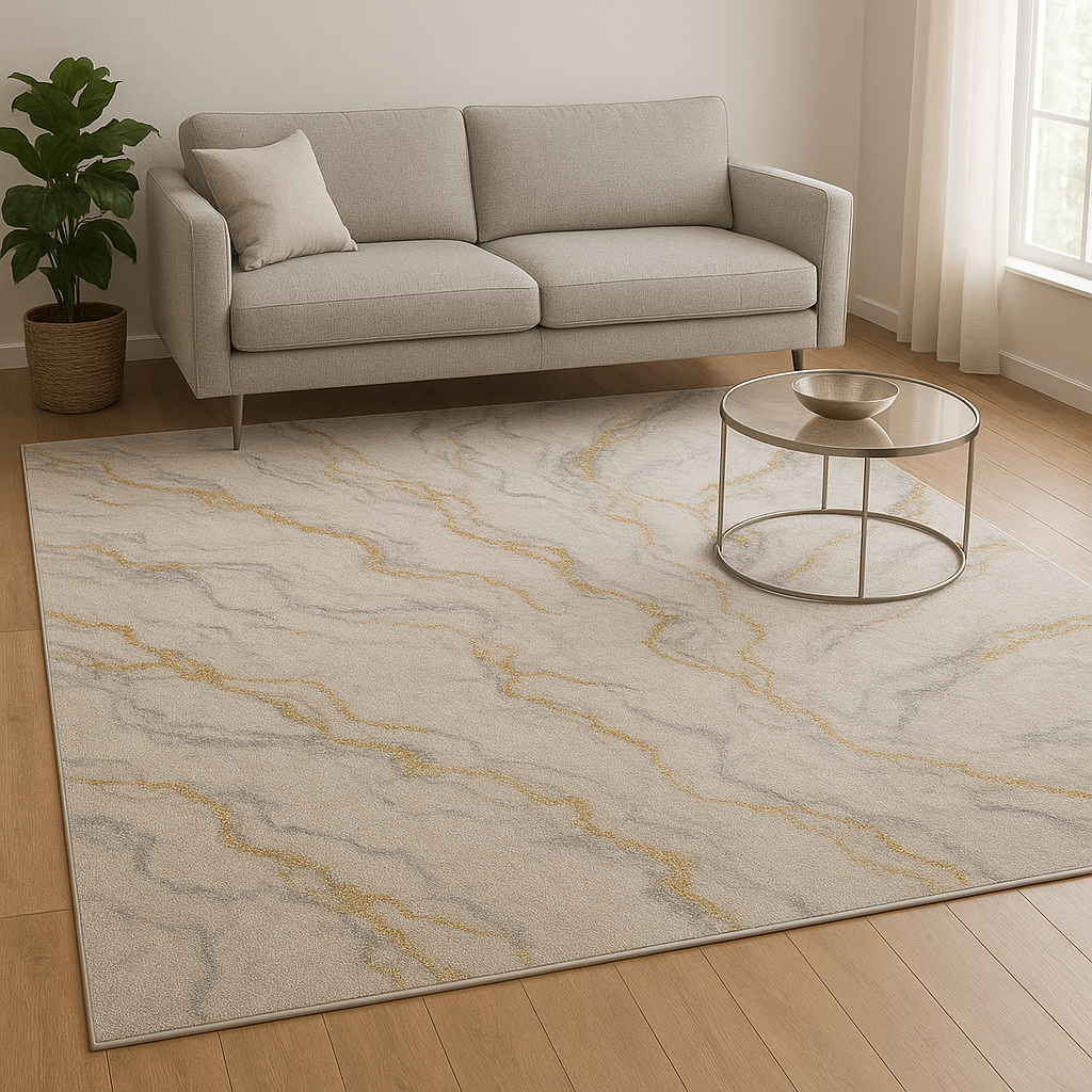 Silver and gold cream marble pattern carpet, brings modern luxury. Soft glitter pattern makes the living room stand out, especially suitable for metal, chrome or Luxury Contemporary style interior.