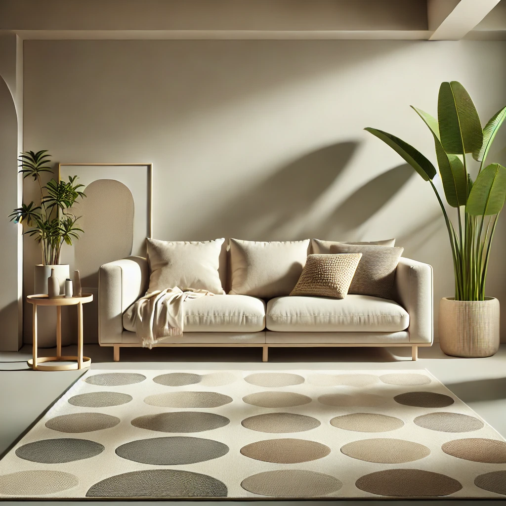 The “soft pebble” dotted rug with neutral tones of beige – gray – light brown creates a warm, minimalist and harmonious feeling for the modern living room.