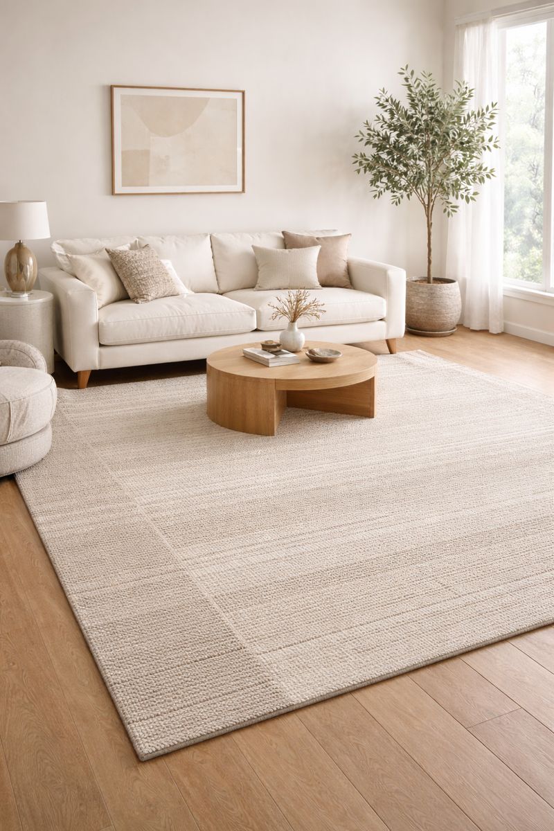 The Topanga Natural Rug Amber Lewis x Loloi features a natural beige tone, fine weave, and a warm, minimalist style. It’s easy to pair with sofas, creating a light, luxurious feel for a modern living room.