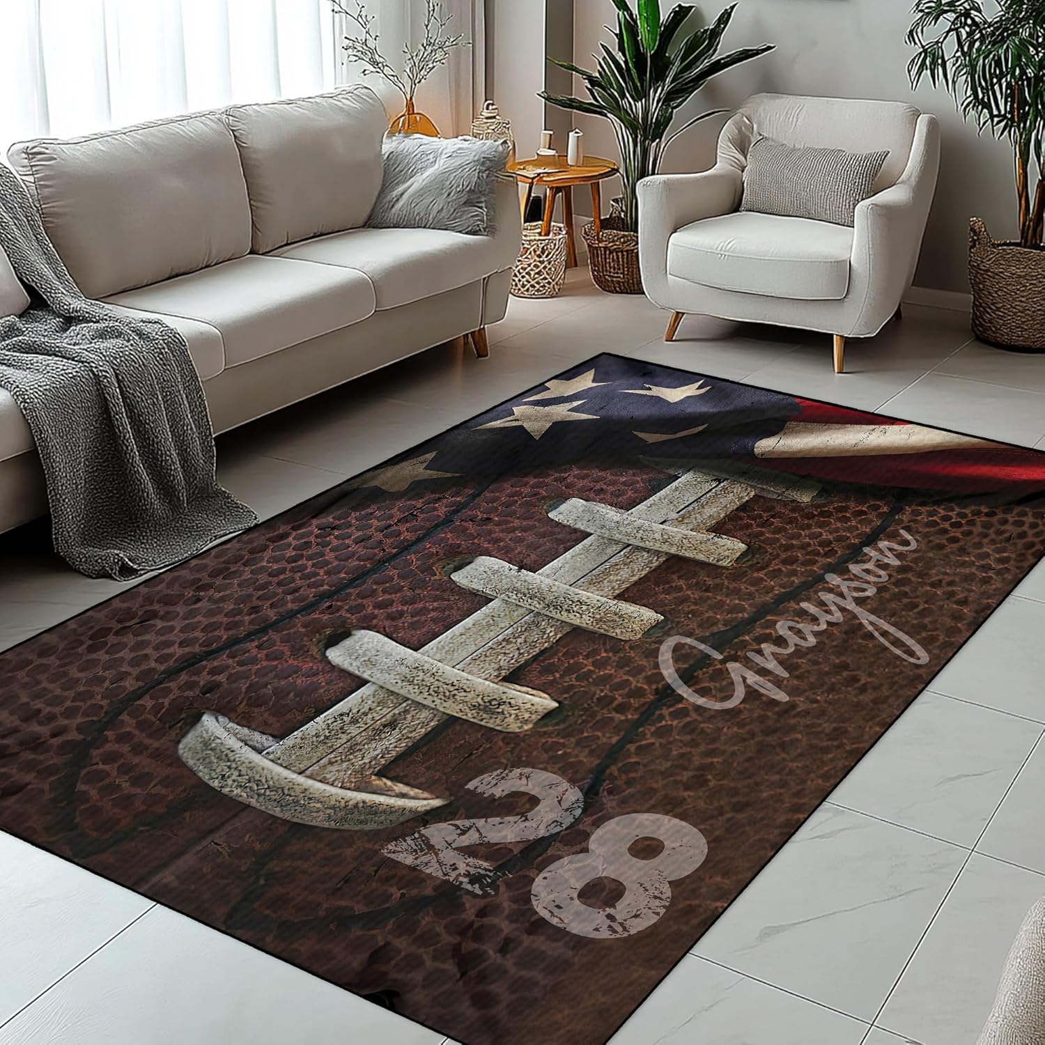 A bold vintage-style rug featuring a classic American football design with rustic textures and patriotic accents—perfect for sports fans, game rooms, or modern living spaces.