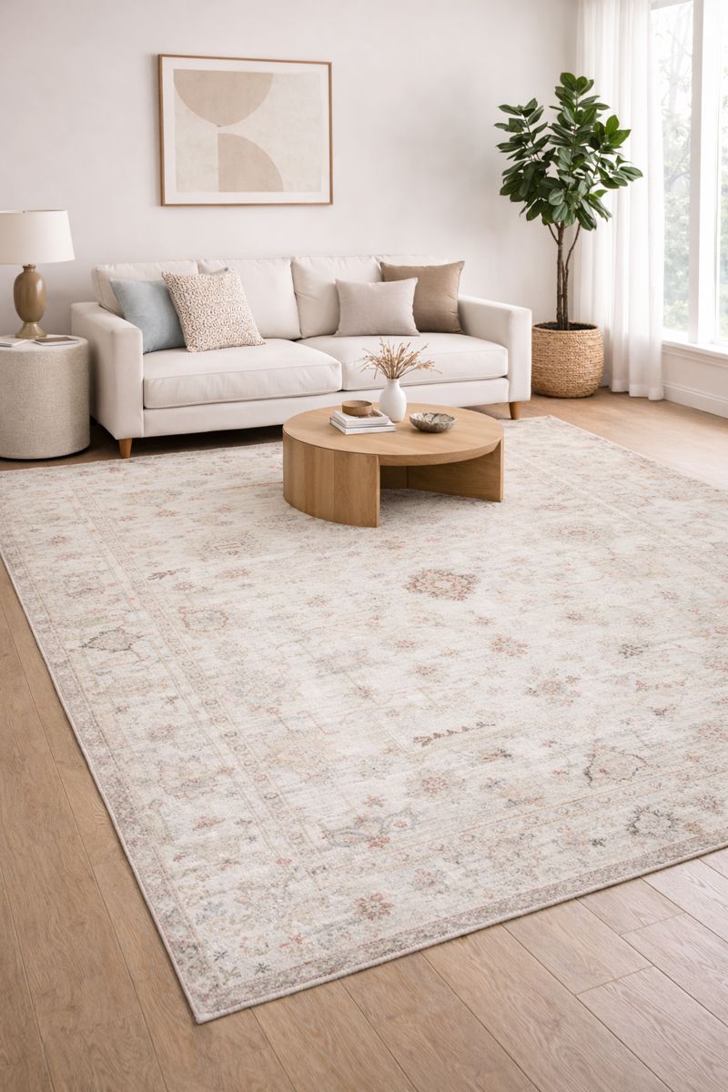 This vintage-style rug, with its dominant cream tone and subtly faded classic pattern, evokes a feeling of lightness, warmth, and elegance, and is easy to pair with light-colored sofas.